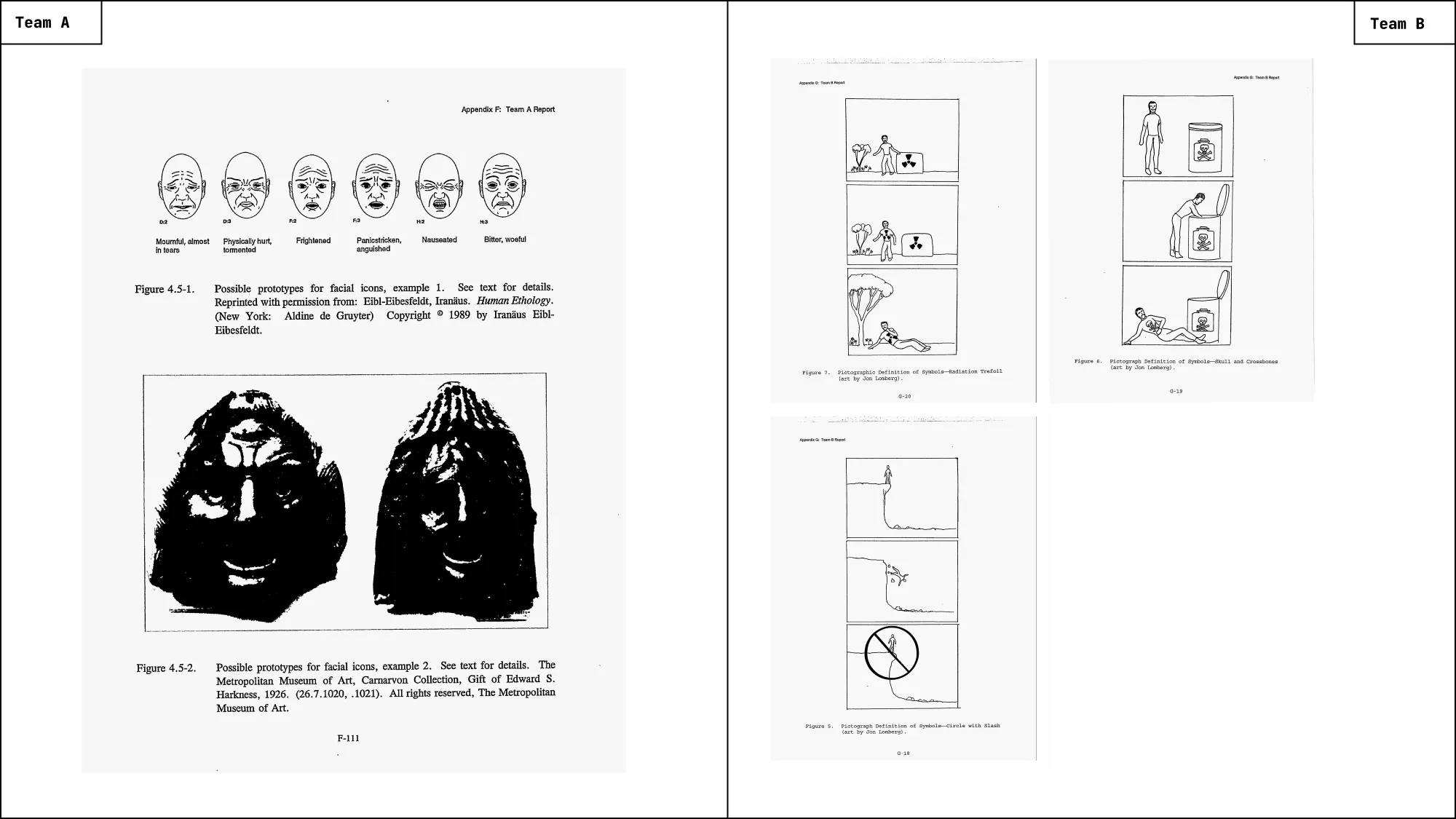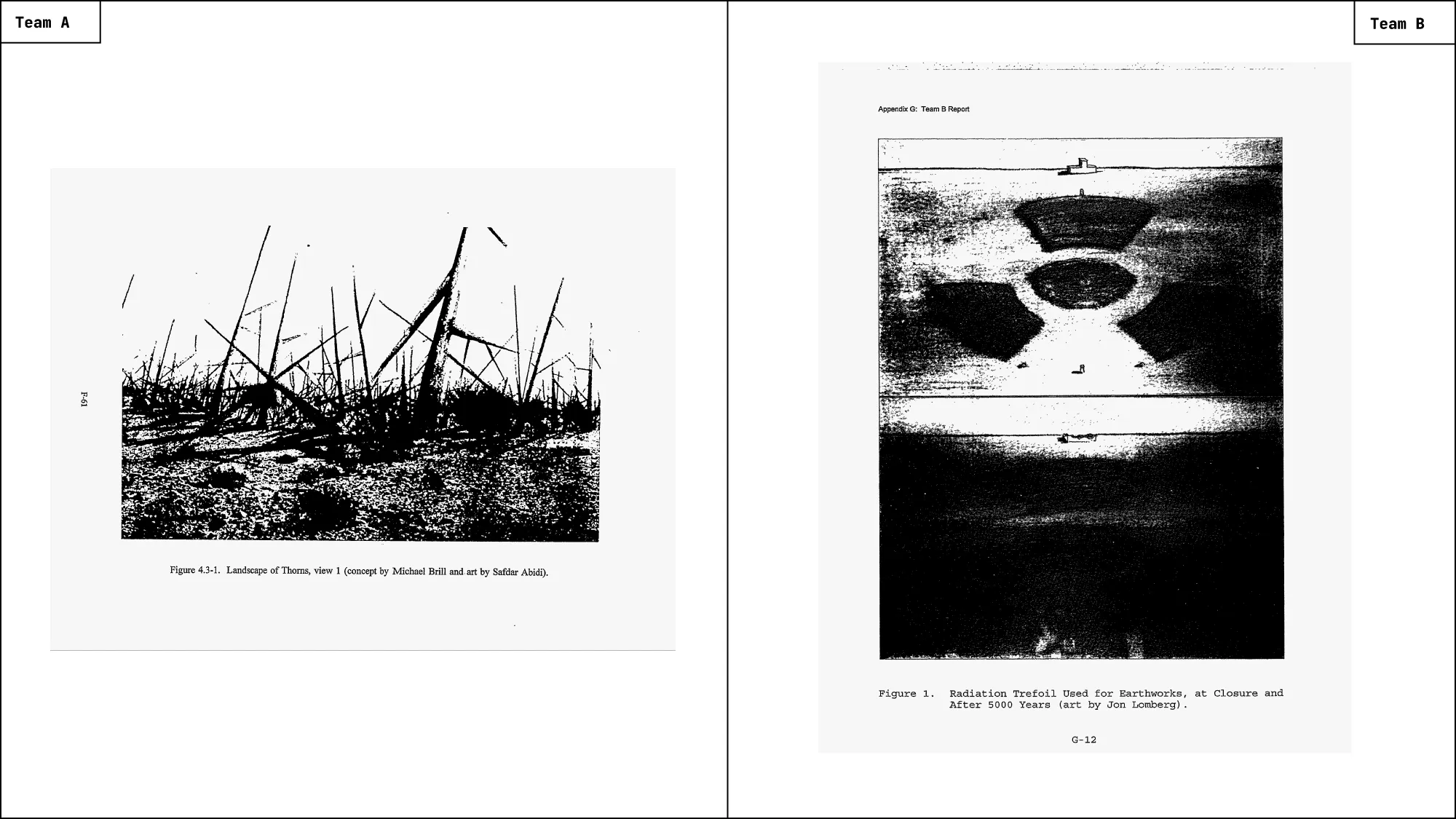 What can be designed to remain meaningful when almost everything familiar has changed? At first glance, the two proposals appear to converge. The report itself includes comparative lists in which both teams employ many of the same elements: earthworks, architecture, symbols, multiple languages, astronomical references, and redundancy. Read as a checklist, their strategies seem nearly identical. The differences only emerge when the proposals are examined as visual systems.