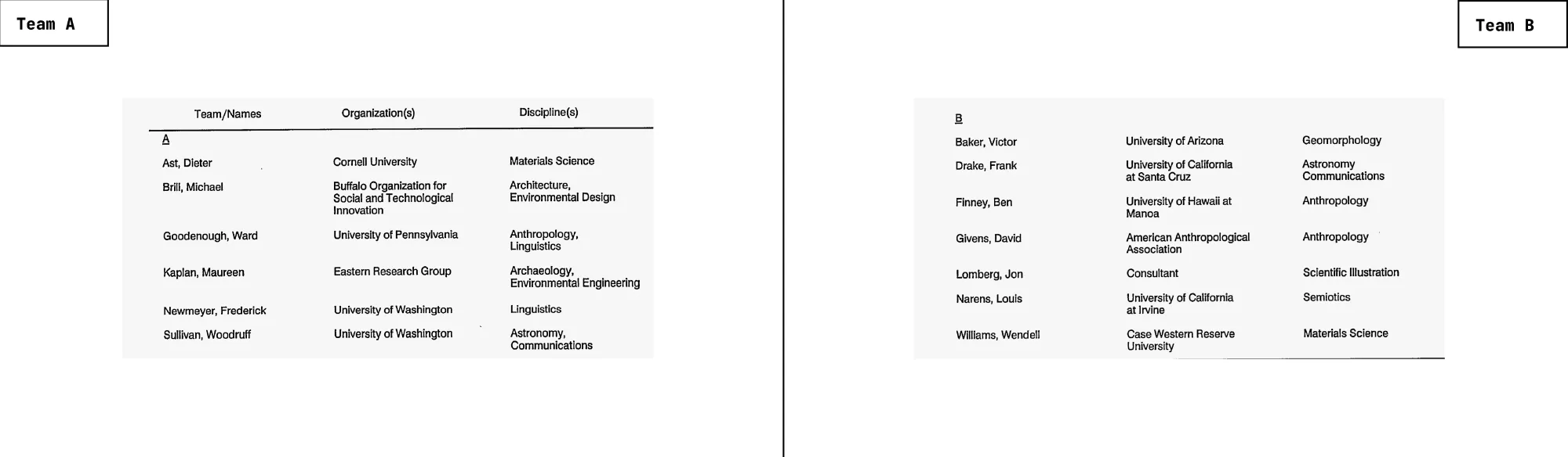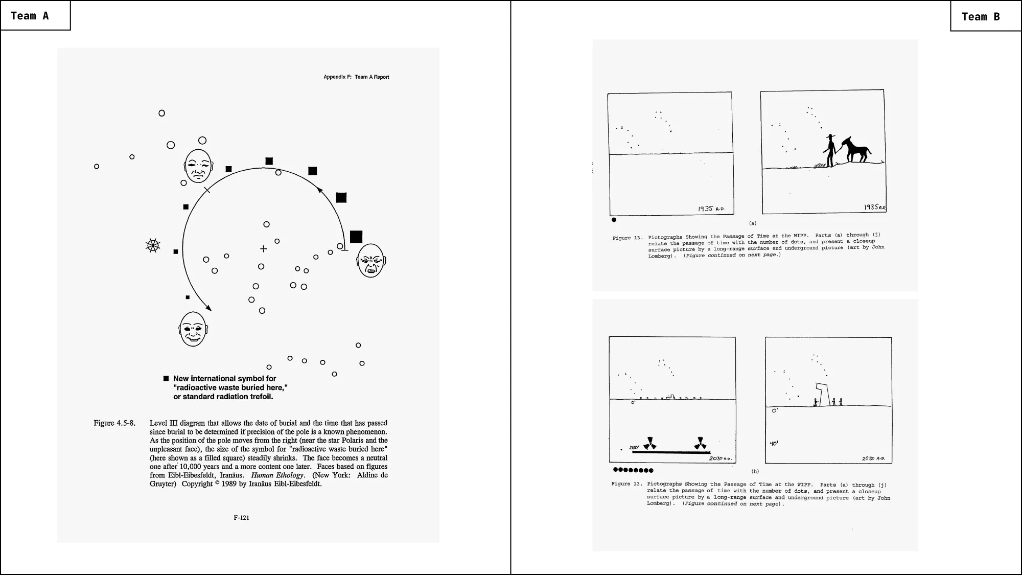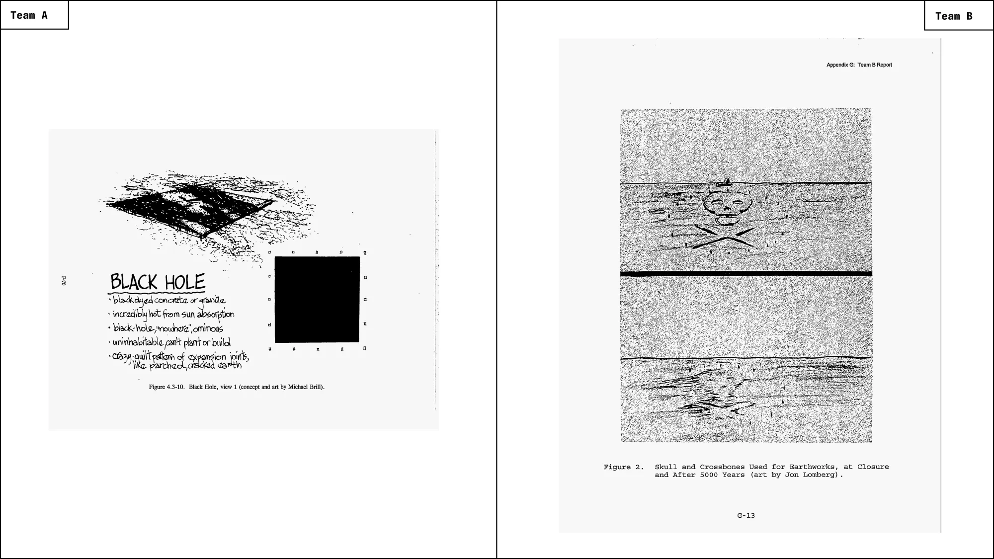 For the study, Sandia assembled two multidisciplinary teams and asked them to work independently. Team A had mostly a background in materials science, architecture, environmental design, anthropology, linguistics, archaeology, environmental engineering, and astronomy. Team B brought together expertise in geomorphology, astronomy, communications, anthropology, scientific illustration, semiotics, and materials science (Fig. 3).