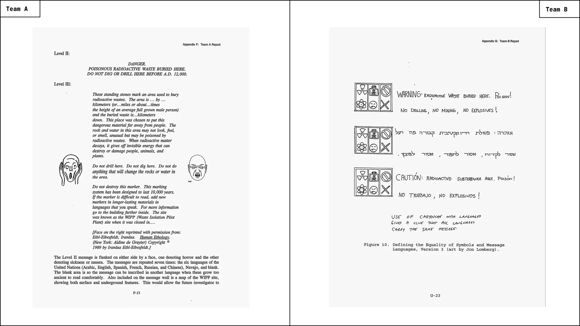 Both teams worked from the same brief: Their task was to propose a marking system that could warn people ten thousand years from now of the toxic danger buried at the Waste Isolation Pilot Plant. The system had to withstand erosion, vandalism, political change, and technological collapse. Furthermore it had to be readable without assuming any shared language, script, or cultural continuity. Lastly it had to convey not only that the site was hazardous, but that the hazard would persist for timescales far beyond ordinary human memory.
