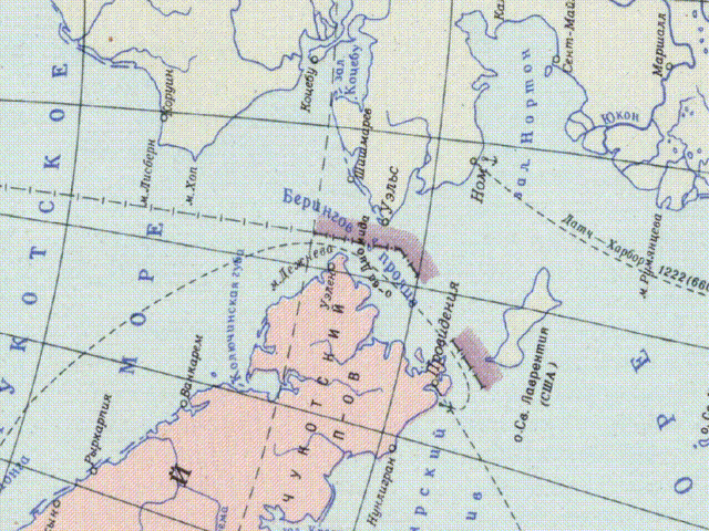 The 1967 edition is particularly notable for including both English and Cyrillic place names. Unfortunately, the digital scan of this edition shows a slightly misaligned page layout caused by the scanning process, introducing a minor positional shift that is mechanical rather than cartographic. Even so, it is possible to watch the distortion policy at work. When the eastern hemisphere is overlaid, the contours of the North American coastline align almost perfectly, while the Russian coastline shifts noticeably.