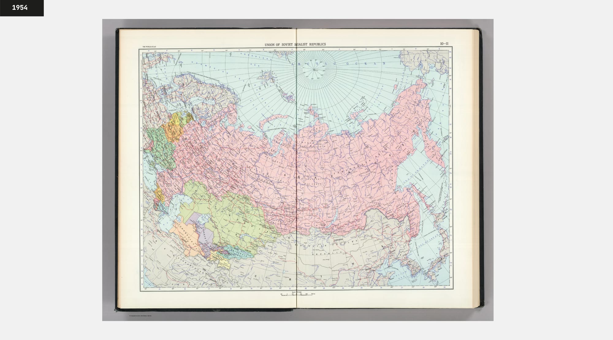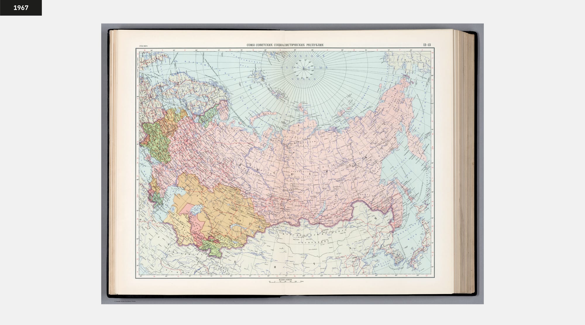 When looking for a proxy to verify the extent of these distortions, the Atlas Mira (translated: Atlas of the World) is a near-ideal source. Produced to high design standards and widely distributed in the Soviet Union, it represents the official cartographic image presented to the public. Two editions available at the David Rumsey Digital Collection — one from 1954 and another from 1967 — offer a rare, directly comparable set of materials.