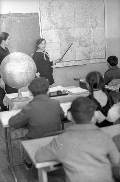 Somewhere in a provincial classroom in 1970s Gujareti, a student stands in front of the class and points to a map of the Soviet Union mounted right beside the blackboard. It is a large laminated 16-panel folded map, probably printed in warm reds and beige tones or similiar colors. The rivers might be coded in blue, mountain ranges shaded in soft brown contours and the cities marked with black contoured circles. The USSR, spanning over 22 million square kilometers and eleven time zones is –at the time of the photograph– vast, ordered and whole.
